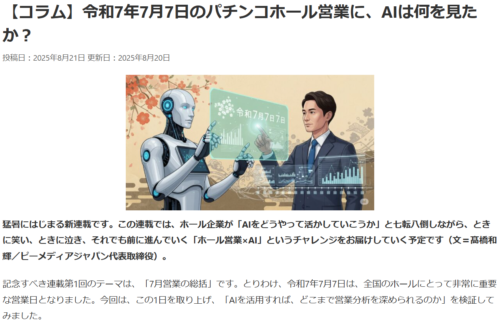 「ホール営業×AI」というテーマで始まった新連載の第1回として、令和7年7月7日の営業結果をAIで総括・分析する試みを紹介しています。